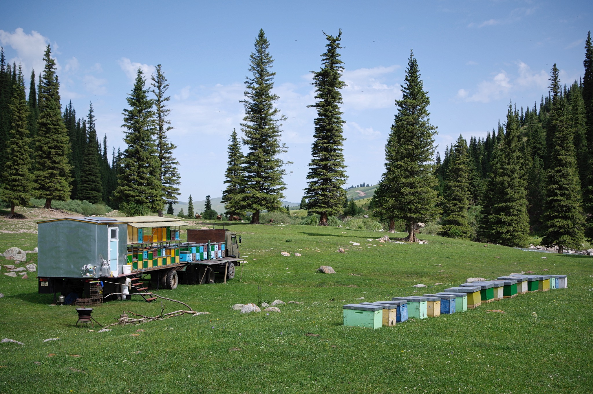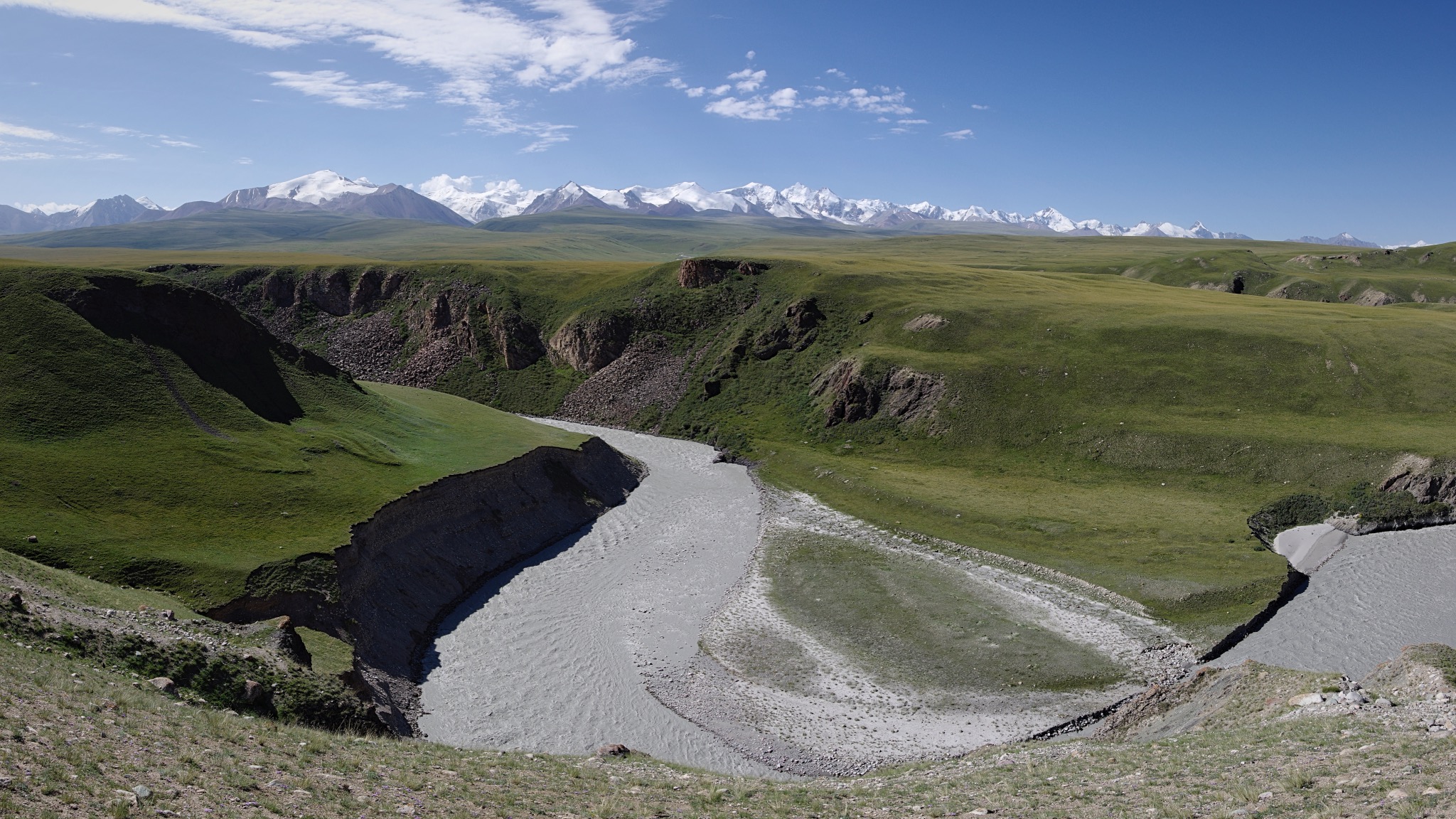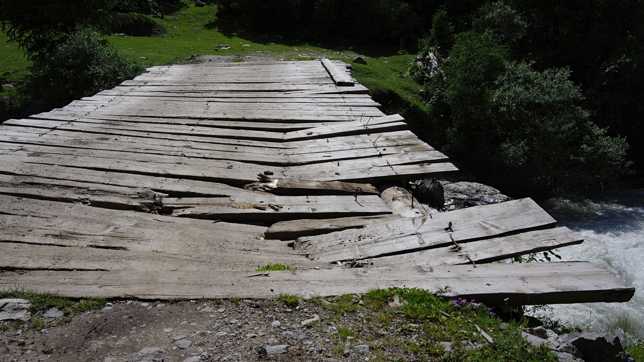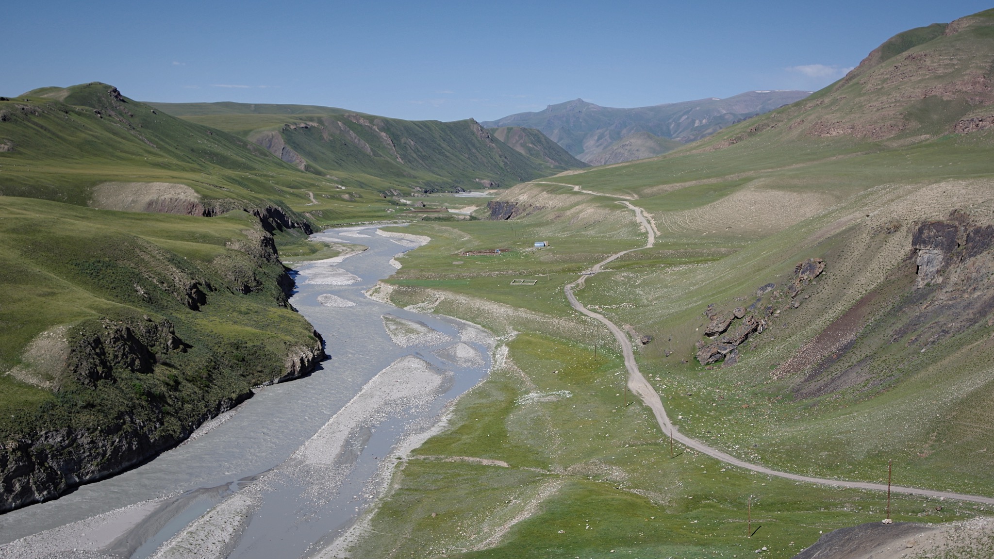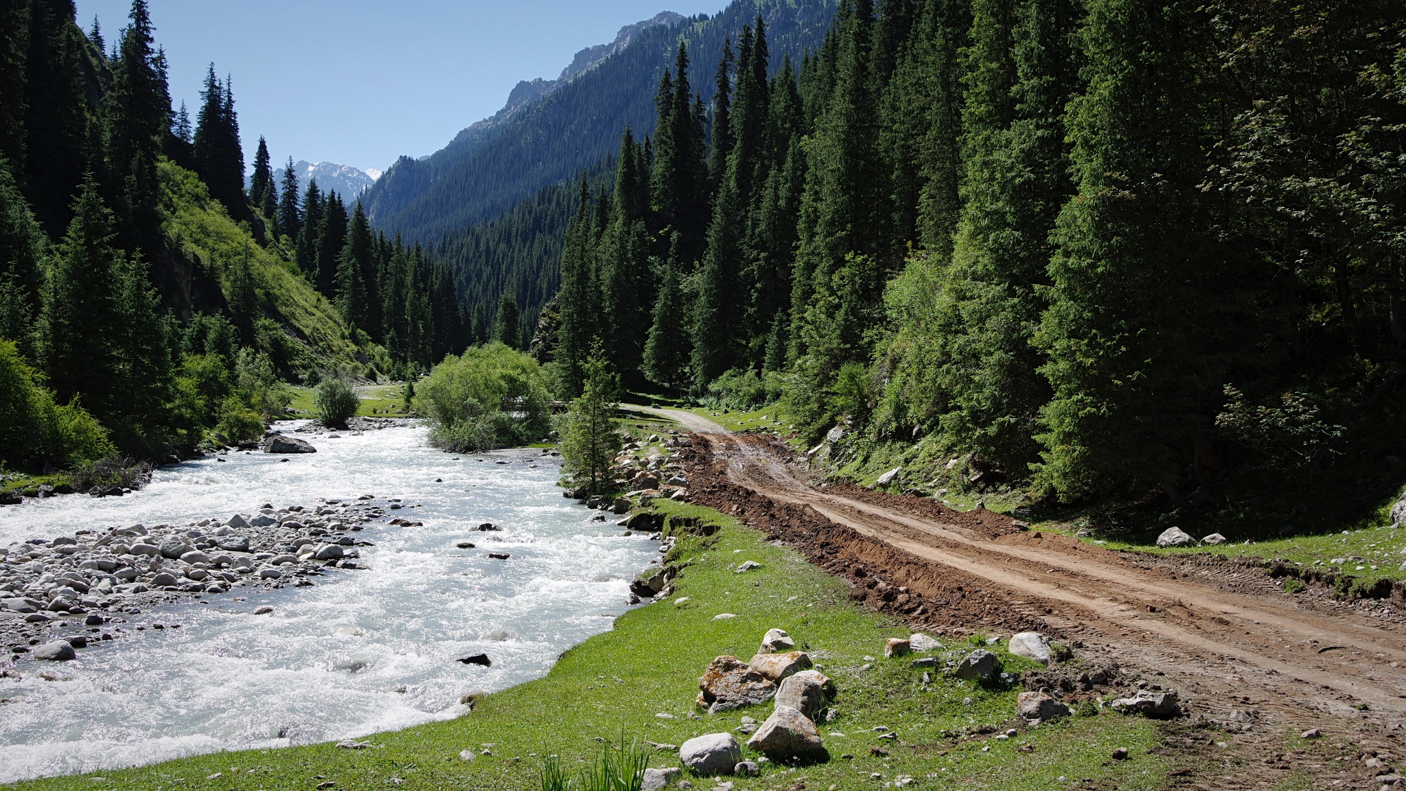 Après le modeste col Ak Tog à 3480 mètres nous entamons un lente et longue descente vers la plaine. Tout change progressivement, la rivière grandit, la vallée se referme, les épicéas poussent, l’activité humaine reprend.