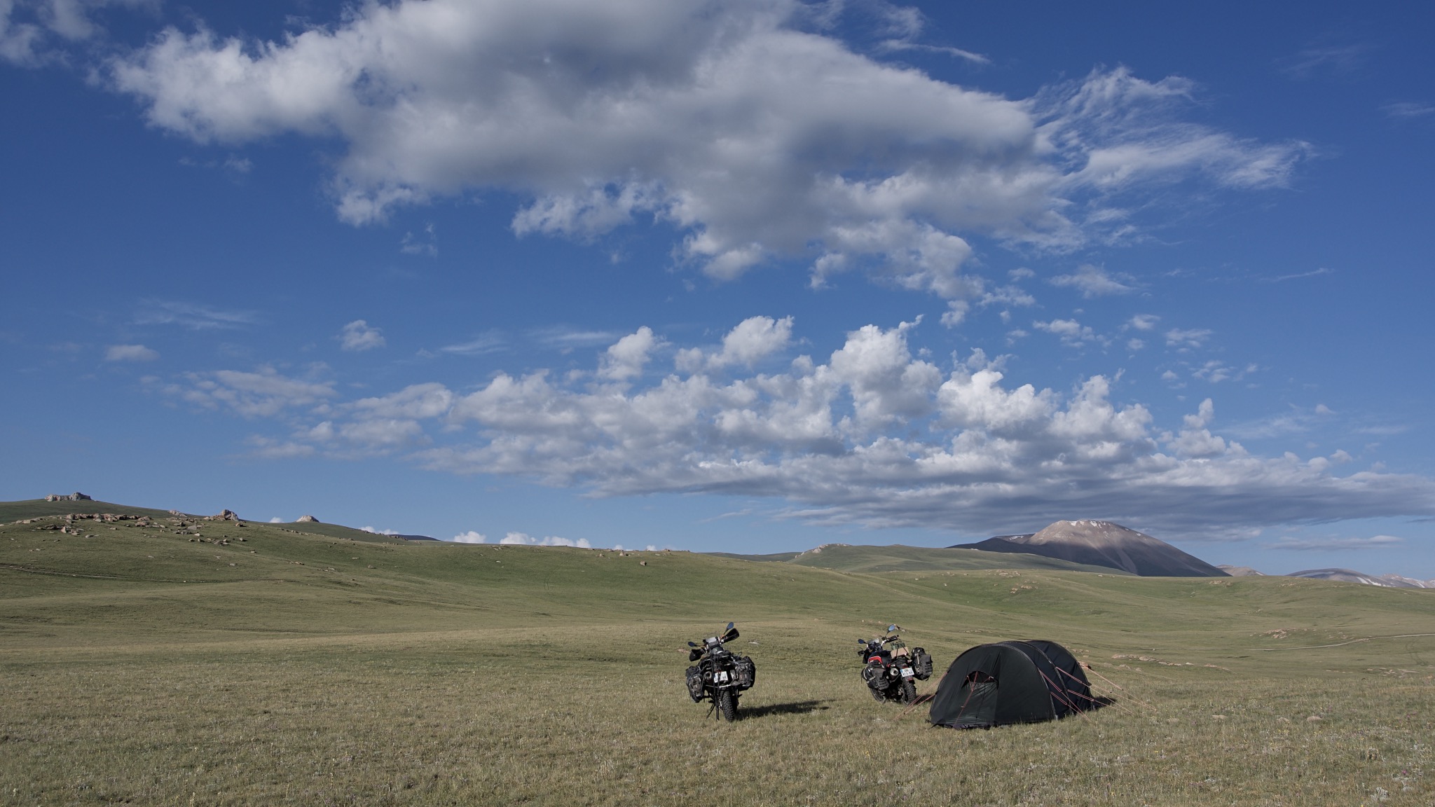 L’appréhension de retrouver les pistes cède vite la place à la jouissance, on s’amuse, on admire, on se régale et nous arrivons heureux au sommet des 33 perroquets pour poser notre premier bivouac.La météo nous sourit, nous abandonnons une piste trop molle et prenons un itinéraire plus sûr pour chercher un camp de yourte pour la soirée. Balade dans les champs d’édelweiss, accueil Koumis, contemplation du lieu… tout va bien.