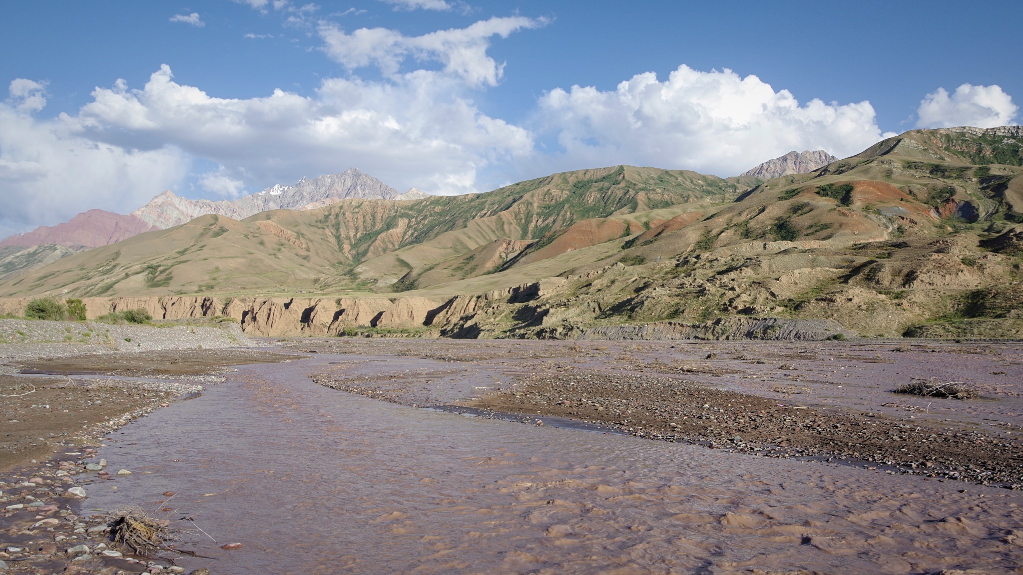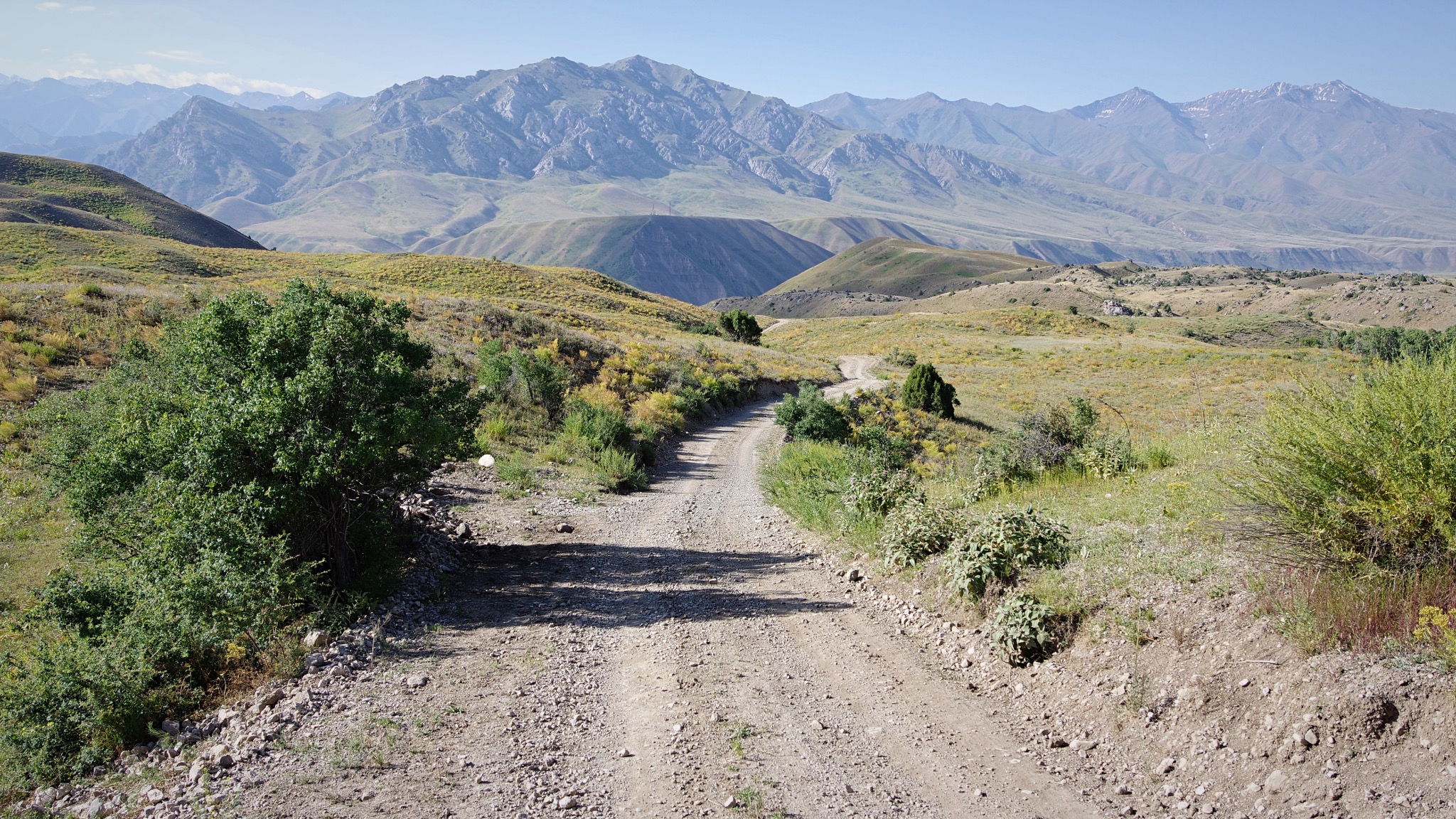 Changement de plan pour aller plus rapidement dans la vallée de Chatcal. C’est beaucoup moins désert que ne le dit la carte et une fois passé le col Chapchama la route devient un enrobé très roulant. La montée au col n’est pas très amusante et pourtant des poids lourds y circulent ! Des routiers très gentils mais ivres dès midi nous serreront 10 fois la main lors d’une pause près d’une fontaine, et tiennent à nous offrir pour le départ un pain et des pommes !