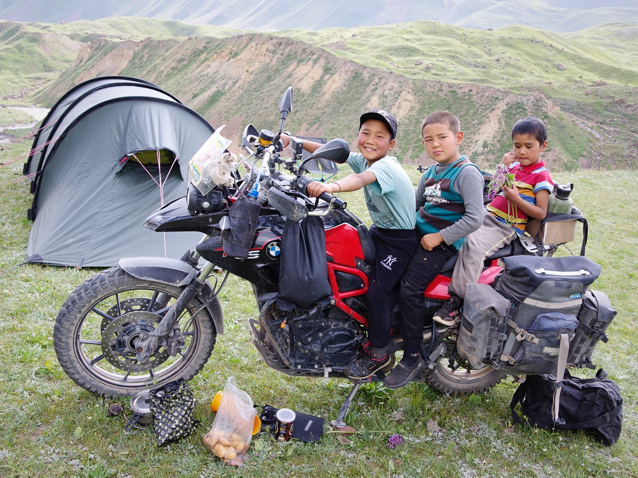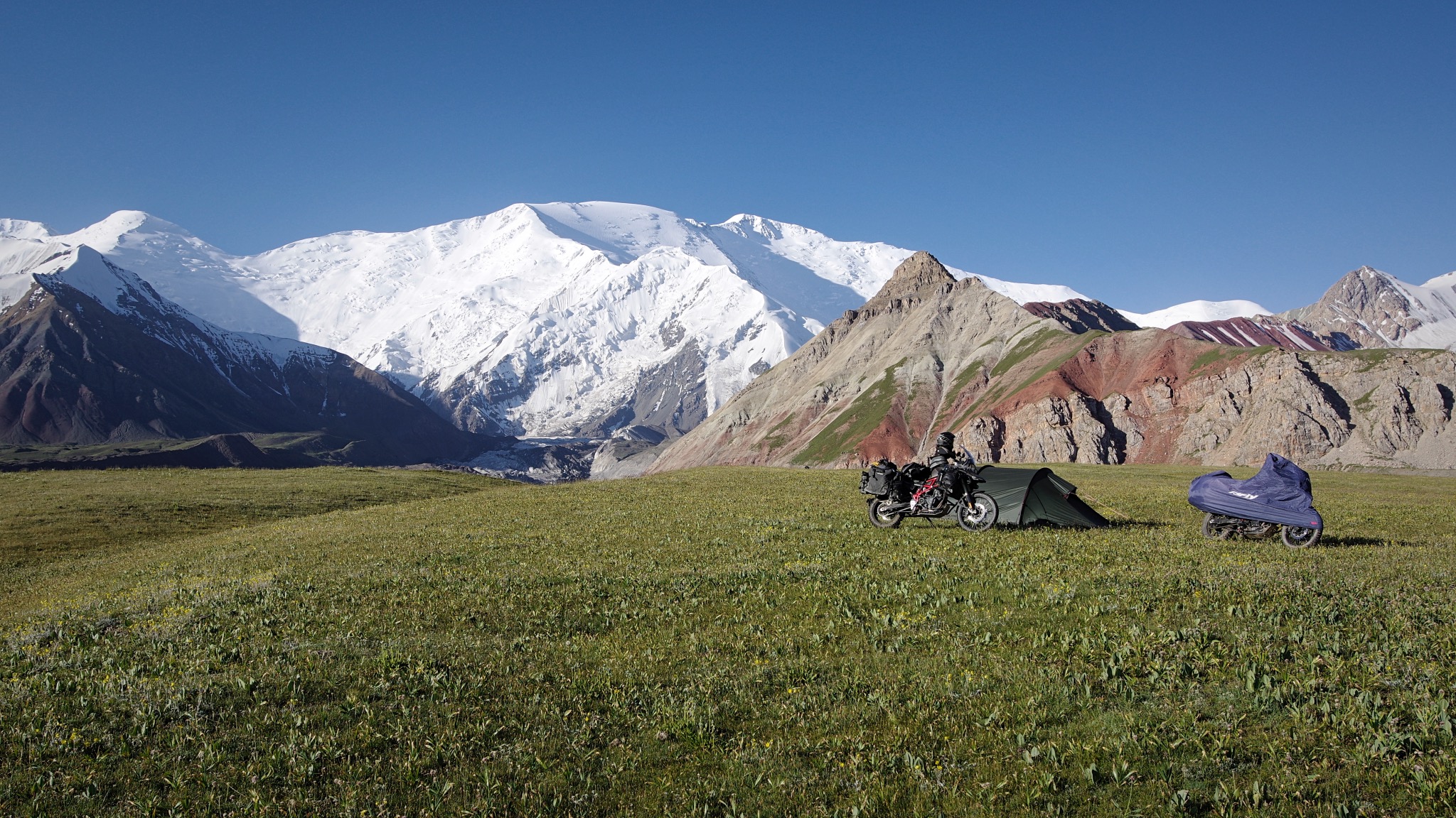 Et puisque le visa Tadjique ne démarre que dans dix jours il nous faut les perdre dans cette région, qu’à cela ne tienne allons rouler ou bout de la vallée et sur des pistes transverses. Les photos parlent d’elles mêmes, si les bivouacs haut perchés sont très ventés nous les posons sur des balcons panoramiques extraordinaires, Le pic Avicenne et ses plus de 7100 mètres nous toise, les édelweiss se couchent sous nos roues, les marmottes sifflent, les yacks s’en foutent et nous on contemple !