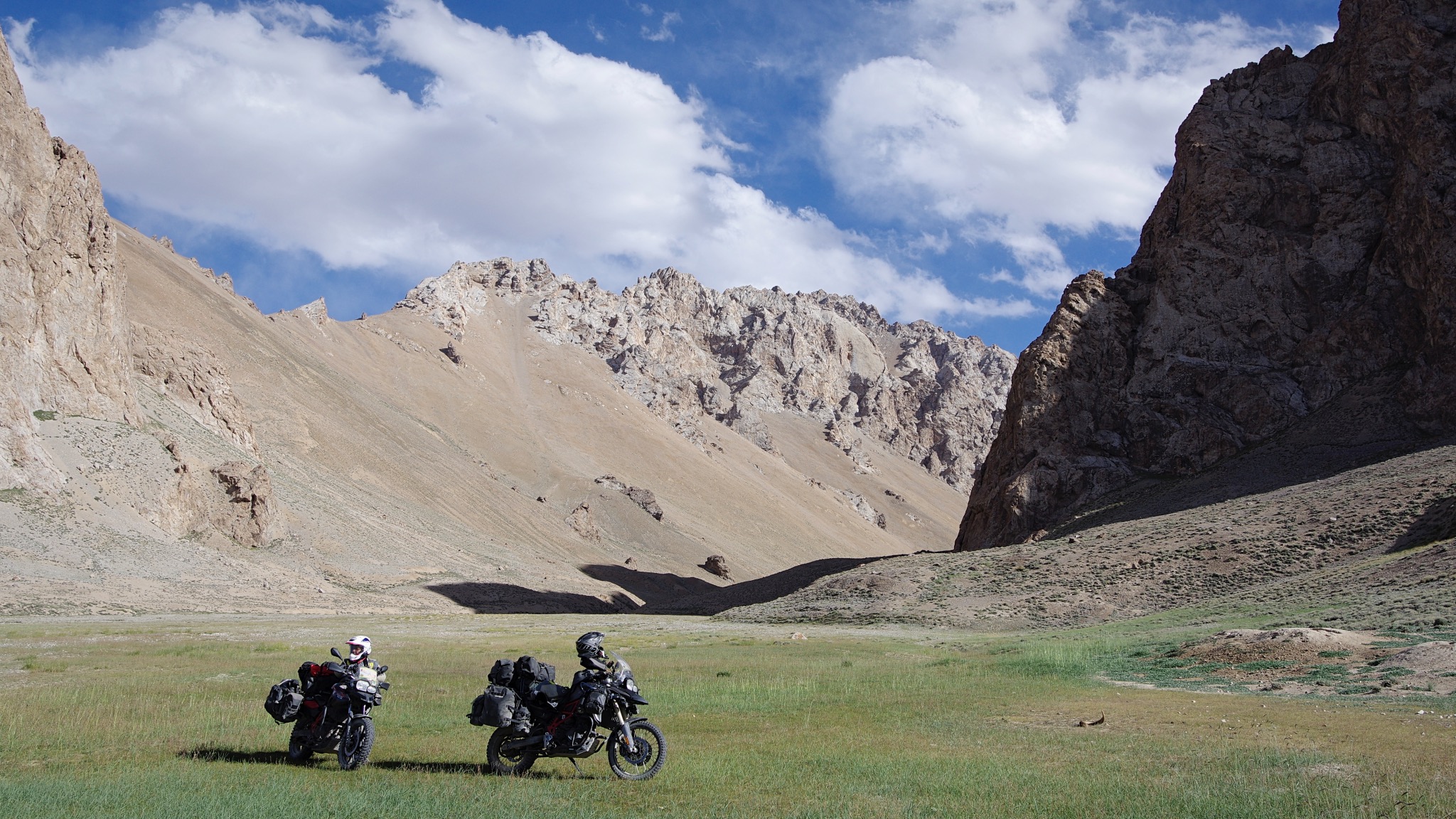 La Guest House Erali et ses très gentils hôtes sera notre camp de base de la première semaine. Nous nous y réfugierons entre deux pistes et entre deux ou trois bivouacs. Nous sommes émerveillés par les vallées dans lesquelles nous posons nos roues, le long de la rivière Murghab, vers le village isolé de Rangkul ou encore vers Cheshtebe où la disparition de la route – enfin de la piste – nous impose un demi tour ! Ce village est pourtant sur la carte, une route le traverse mais sur place tout est abandon, il n’y a pas de pont pour traverser deux gros cours d’eau et malgré l’envoi du drone en reconnaissance nous n’observons qu’un cul de sac ! Ça n’est pas grave, la piste qui ne descend pas en dessous de 4000 mètres était magnifique à l’aller, elle ne le démentira pas au retour !