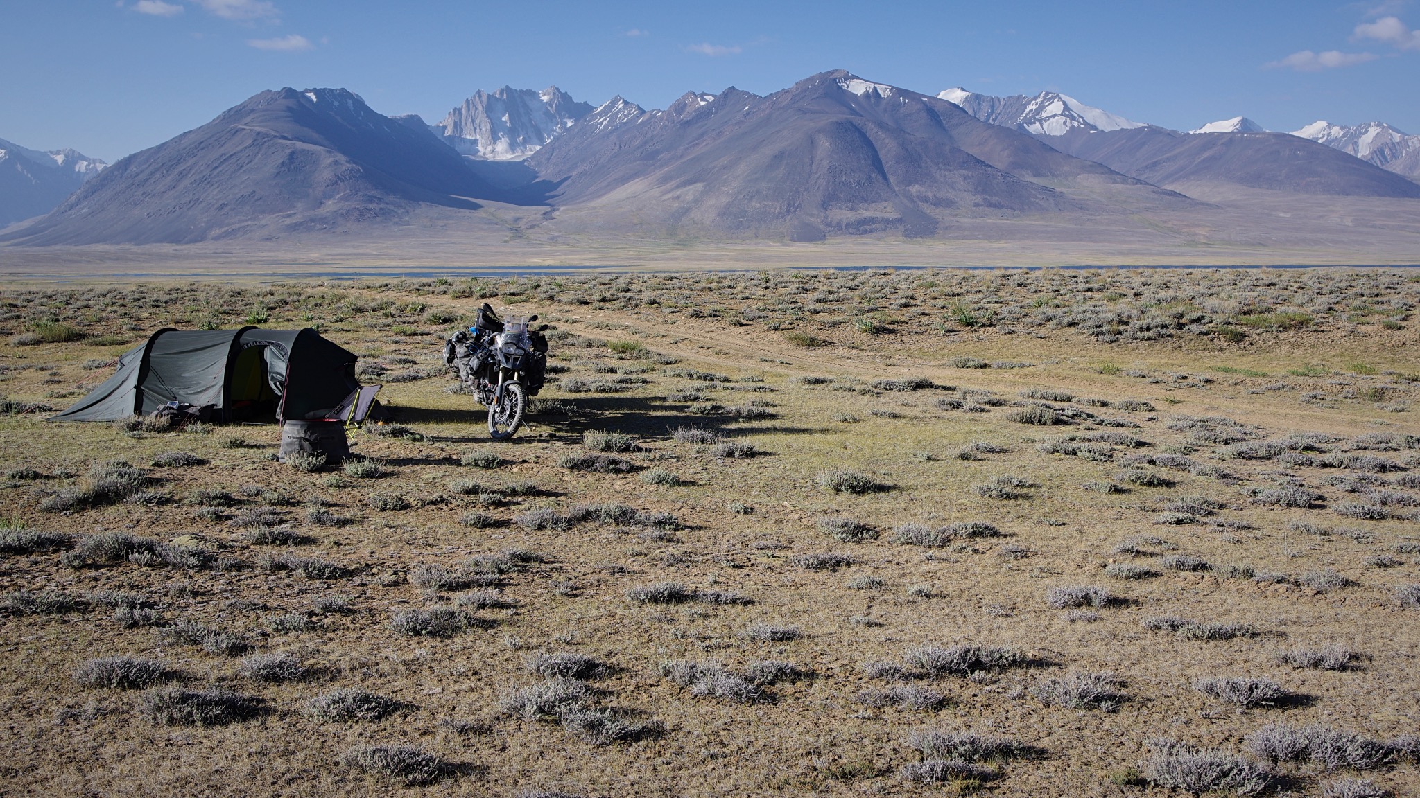 Juste après le village de Karakul où nous avons trouvé quelques tomates et de pauvres carottes le bivouac planté à proximité du lac ne taira pas l’excitation, il montera certainement sur le podium des plus beaux arrêts dodo de notre petite histoire.