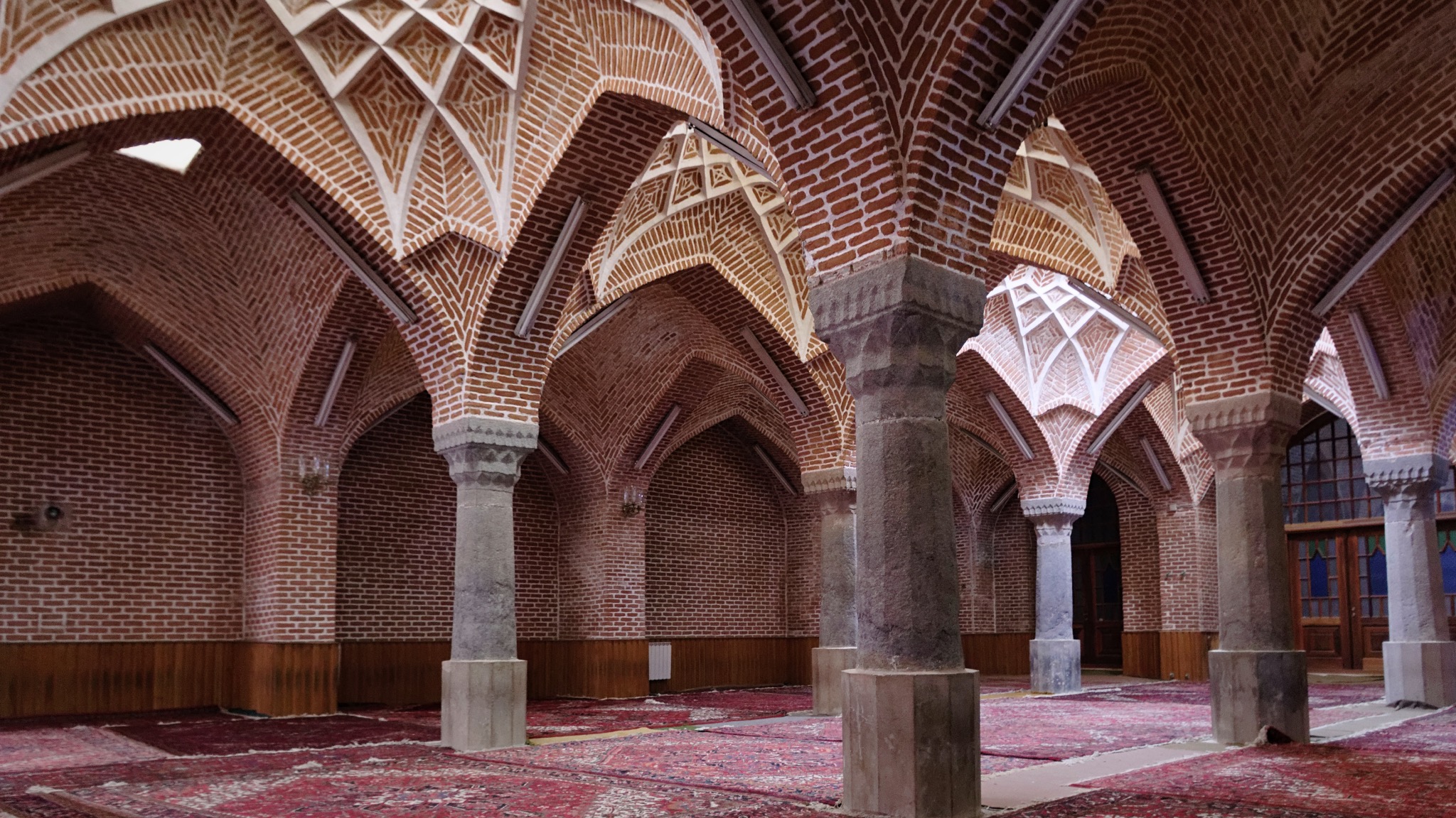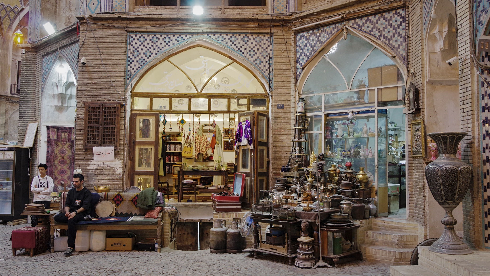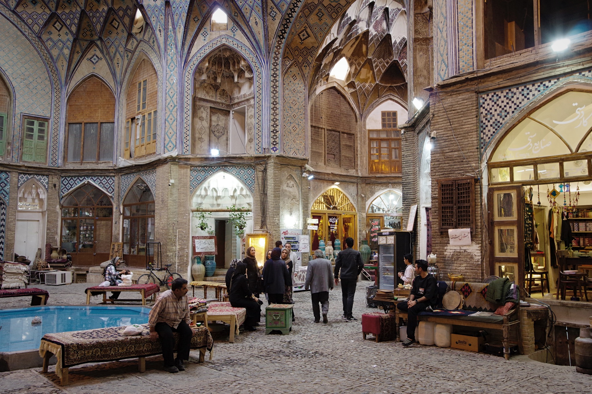 Nous voulions monter ensuite dans le parc national de Kavir mais son accès est trop compliqué pour les étrangers, nous restons à Kashan et découvrons cette ville avec enchantement. Le souk peu animé le matin se prête à une agréable promenade et s’ouvre sur de nombreuses petites ruelles pleine de charmants secrets, cours intérieures, mosquées, tombeaux et j’aurai un faible pour le magnifique caravansérail Aminoddole dont les arcades sont hautes et harmonieusement colorées, les cellules sont aménagées en boutiques de tapis anciens, ateliers d’artistes, antiquités dans une jolie gamme de couleurs. Vous l’aurez compris, j’ai aimé cette ville !