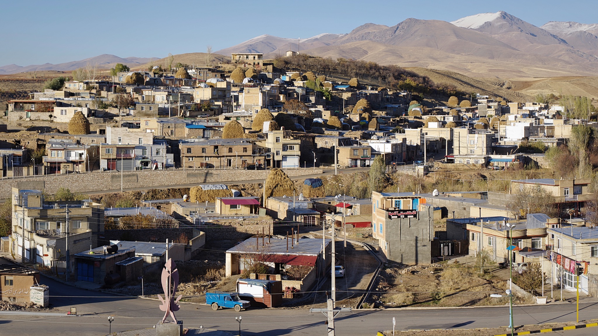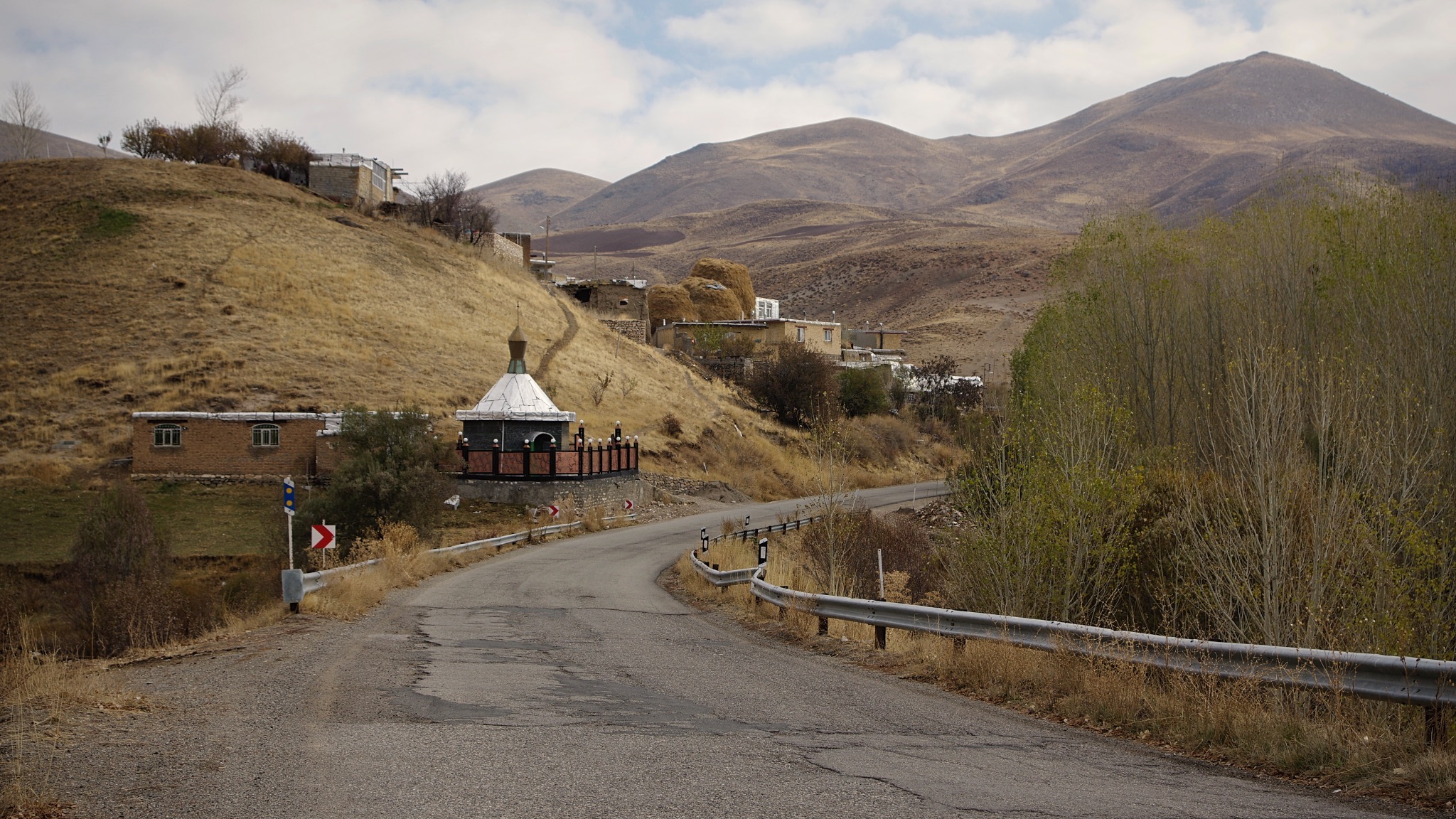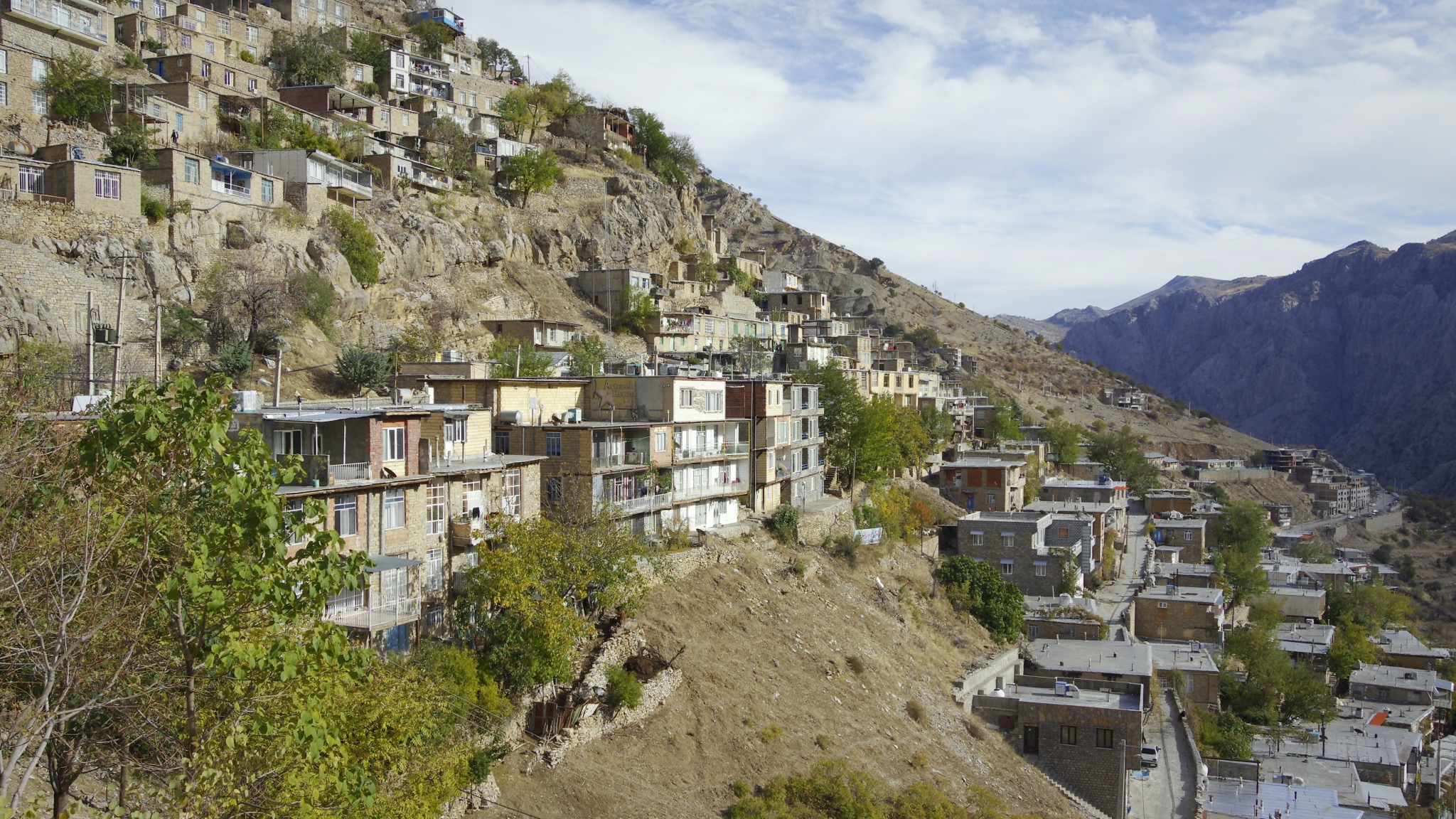 L’approche de Paveh nous réjouira un peu plus, les reliefs s’élèvent la méteo reste froide mais avec un ciel bleu c’est supportable. Nous voyons les premiers villages kurdes, maison à toits plats bâties sur flancs de montagne. Nous prenons une petite route jusqu’à Najjar et une maison d’hôtes sur les conseils de Michel et Cécile. Notre hôte témoigne de la gentillesse kurde, il veut s’assurer que tout va bien pour nous et ira jusqu’à nous offrir les dîners.